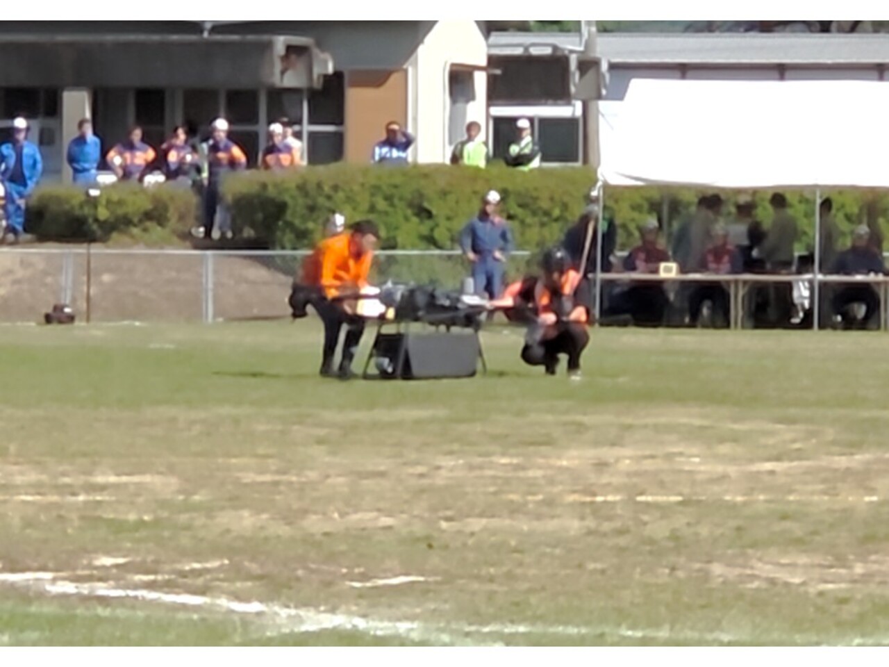 ヘリの飛行に備えグランドに放水する消防団員の皆様