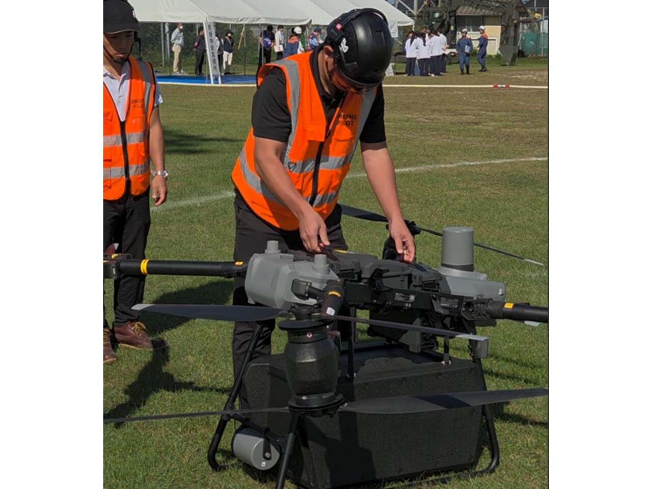様々な災害現場の人命救助、復旧活動が実施された中、当協会は災害時の迅速な情報収集、情報発信を目的とした情報収集用ドローンの展示飛行を行うとともに、被災地への支援物資搬送を想定した物資空輸ドローンの展示飛行も実施しました。