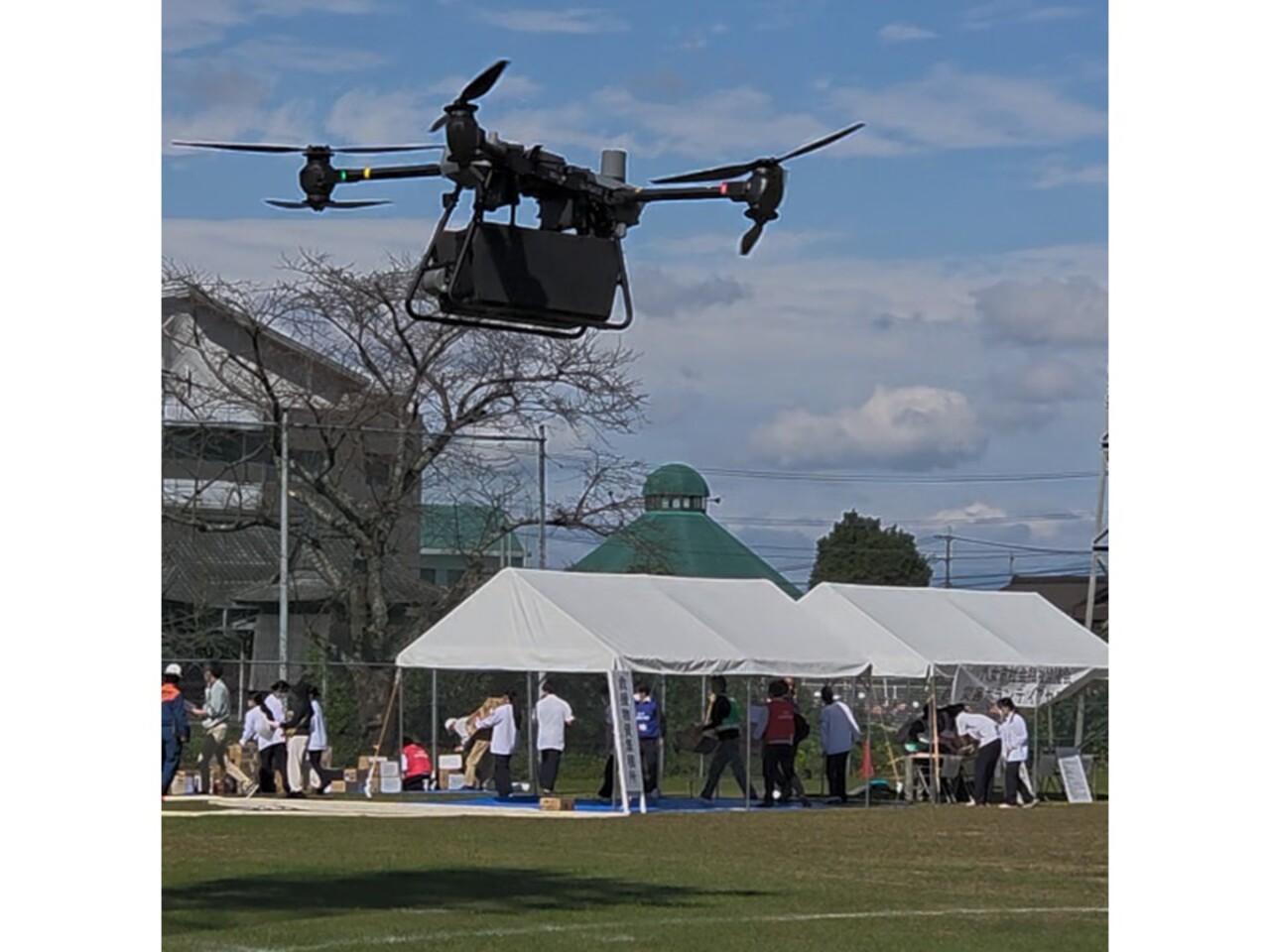 物資空輸ドローンの展示、30kgまでの物資を空輸できます!